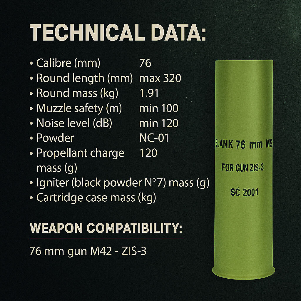 This is a 76 mm blank round, designed primarily for training and ceremonial purposes with the M42 ZIS-3 field gun. Blank ammunition does not contain a projectile, and its primary function is to replicate the sound and pressure of live firing without the risk of a projectile being launched.